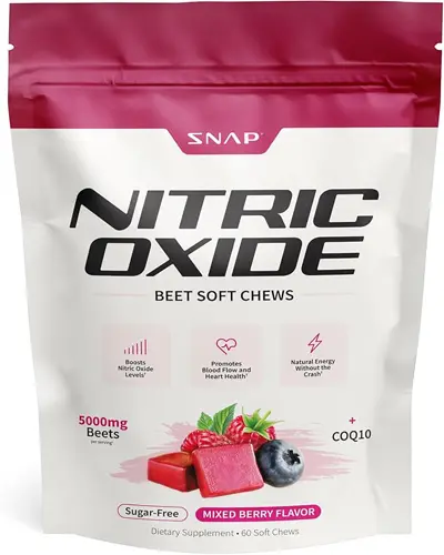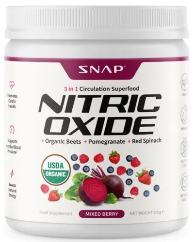 Snap Supplements Organic Beets Powder is a USDA organic nitric oxide supplement featuring a comprehensive “Nitric Oxide Complex” containing nearly 6,900mg per serving of organic beet root powder, pomegranate juice powder, OxyStorm® red spinach extract, B vitamins, vitamin C, and black pepper extract for enhanced absorption. Available in Mixed Berry, Cherry Lime, and Apple flavors, it provides 30 servings per container and is formulated to support cardiovascular health, blood pressure, and natural energy.