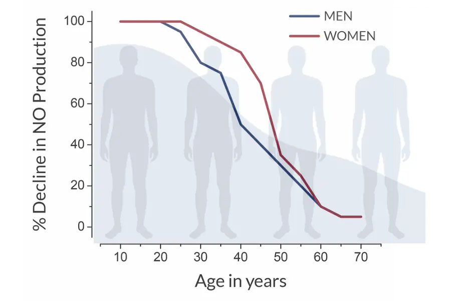 As we age, nitric oxide production decreases by up to 50% by age 40. This decline can lead to poor circulation, higher blood pressure, and lower energy. Many cardiovascular issues are tied to low nitric oxide, making it critical for Americans to address this deficiency for better health.