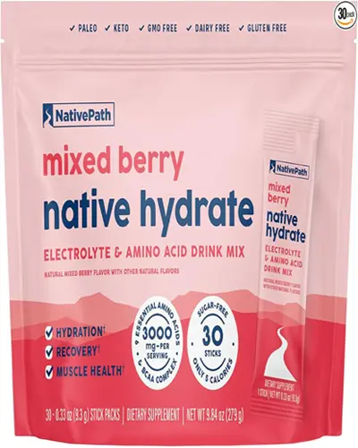 NativePath Native Hydrate utilizes Cellular Transport Technology (CTT®) to deliver hydration 2-3x faster than water alone. Made with an optimal sodium-to-glucose ratio based on the World Health Organization's oral rehydration solution that combines 14 vitamins and minerals, all 9 essential amino acids, and 2,000mg of BCAAs in one comprehensive drink mix. This zero-sugar hydration solution supports Instant recovery, muscle cramps & fatigue, cognitive function, and whole-body hydration.